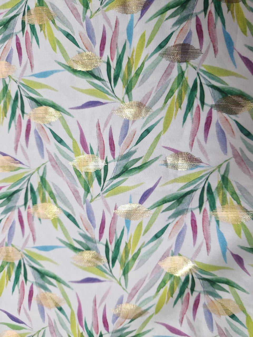A Touch of the Tropics: This kaftan features a captivating, all-over tropical leaf print. The pattern showcases a fresh, vibrant palette of spring greens, lilac purples, and subtle yellow-greens, all set against a luminous white or pale base. The delicate, watercolor-style application of the print gives the kaftan an upscale, artistic aesthetic.